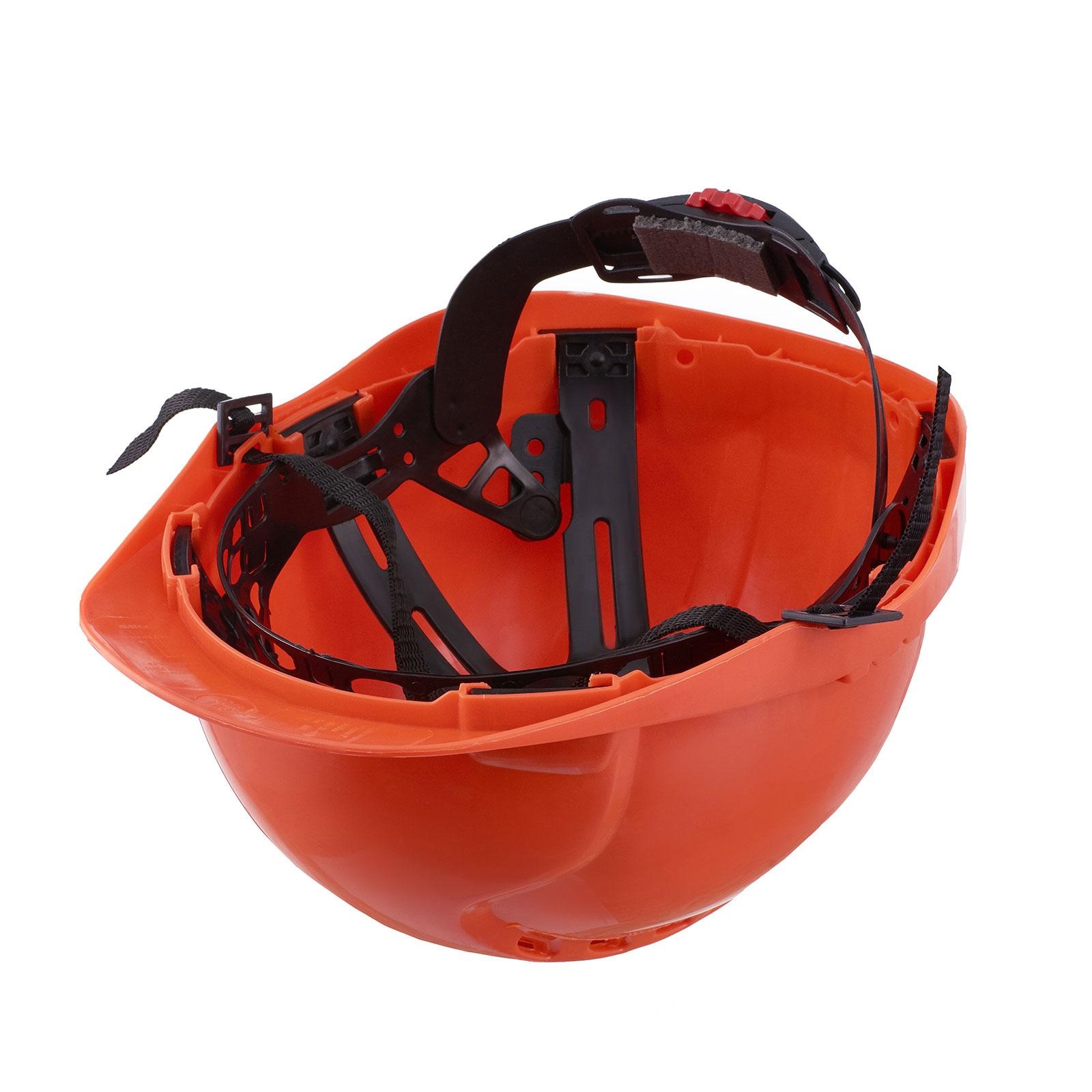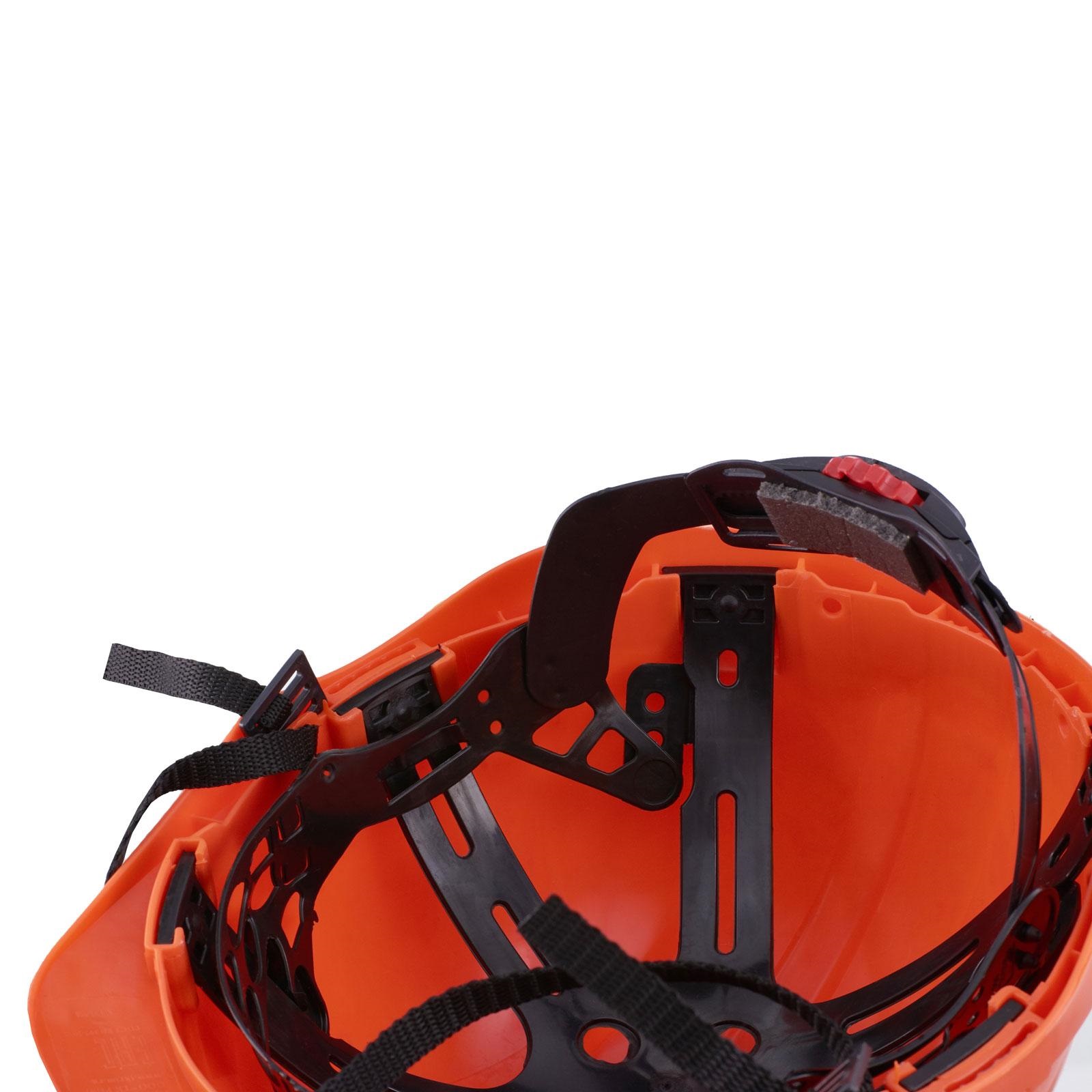 Каска выполнена из ударопрочного полипропилена, с удобным храповиком, регулирующим размер, а также с регулируемой глубиной посадки каски (3 положения).